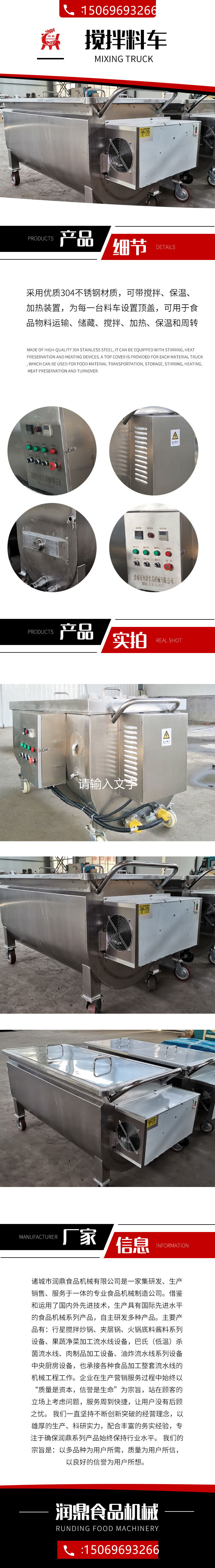 组成:采用304不锈钢材质,可带搅拌、保温、加热装置,为每一台料车设置顶盖,可用于食品物料运输、储藏、搅拌、加热、保温和周转。